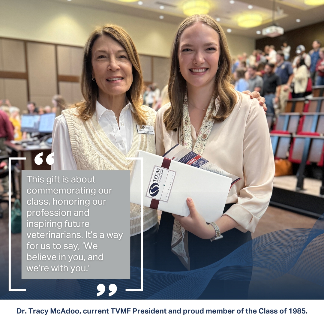 Indeed, the Class of 1985’s decision to entrust their legacy to TVMF is a testament of their generosity as individuals and commitment to advancing veterinary medicine in Texas, regardless of one’s alma mater. Their gift will have a direct impact for hundreds of students every year,—180 at Texas A&M and 100 at Texas Tech—and inspire careers of service, leadership and community among the next generation of veterinarians.